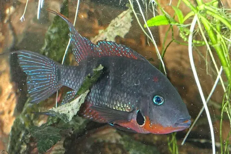 Male fish of this type of cichlid is known to bloat their gills up to scare off predators or other males. This exposes the red color on their throats. When people watch this feature of the fish in action, they find it incredibly cute.