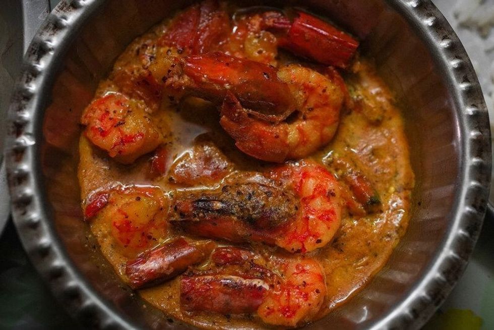 Chingri Malaikari is a curry that is made with king and tiger prawns combined with coconut milk and spices. It was extremely popular during British rule in India.